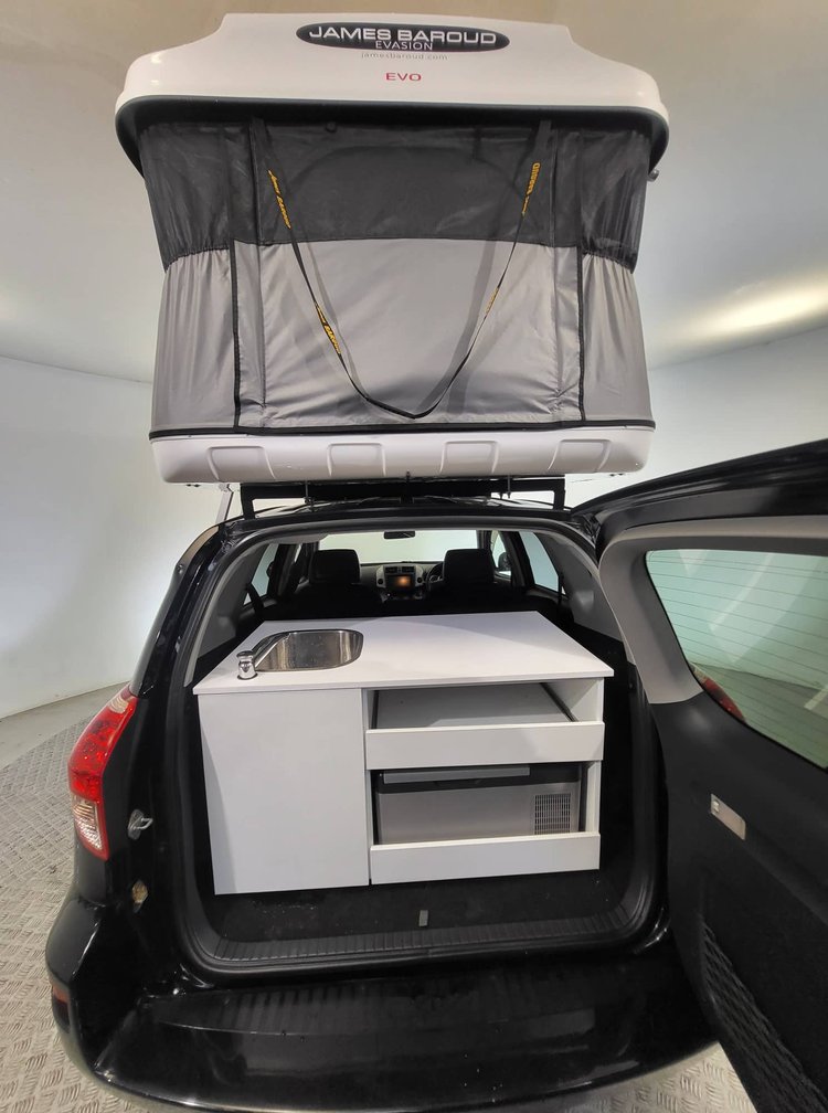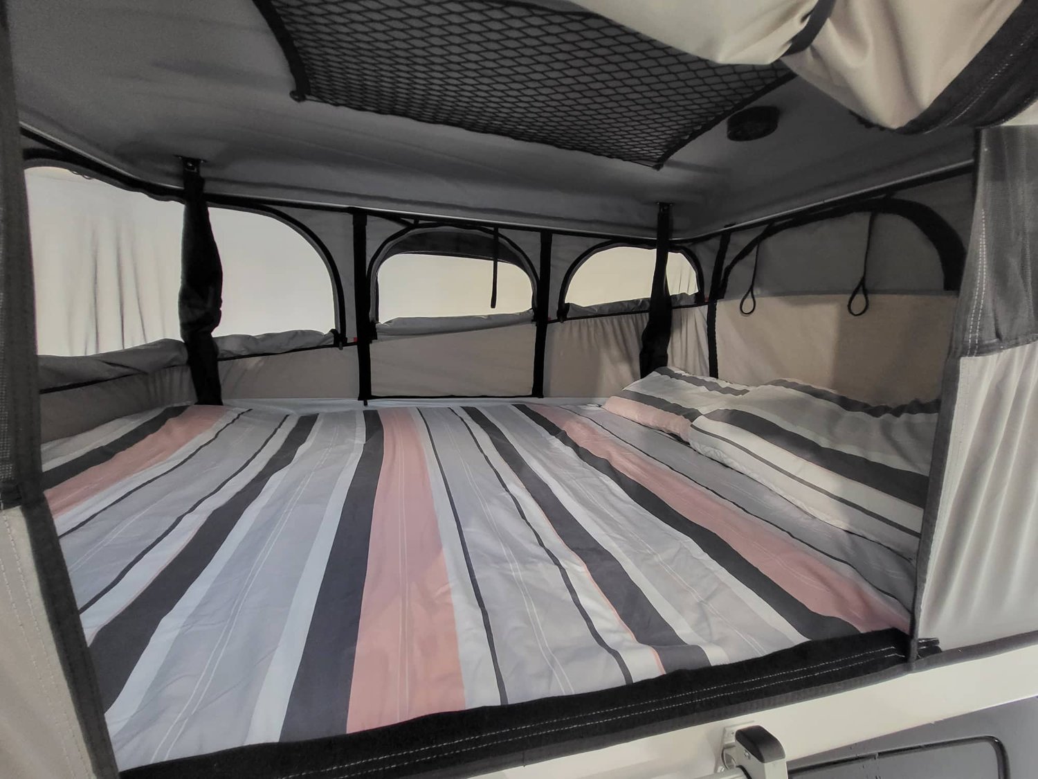 A super comfy and spacious roof top Tent (Width 140cm, Length 200cm, Open Height 100cm, Closed Height 33.5cm, Capacity 2 people)