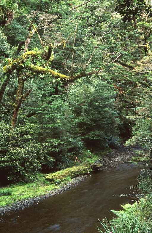 Some kahikatea reach over 60 metres in height, many with a massive girths. “These giants thrust up like swords to the light of the open sky”, writes Morton. The primary canopy is complete, old and virtually closed. The foliage of the sub-canopy also shades the forest floor, so the interior is devoid of substantial seasonal fluctuations. Empires of epiphytes and twisted liana bejewel the branches and trunks of their hosts. The evergreen leaves and honey-green of the dominant tawa sub-canopy filter through a sublime light.