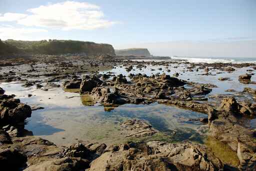 Follow the track past the flax then descend the wooden steps to the inter-tidal rock platform. Explore at leisure.