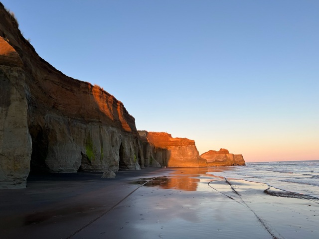 Volcanic black sand, piles of ageing driftwood, the thunder of waves breaking on grey stone formations and the early morning light reflections are spectacular. It’s a freedom camp with clean toilets. Didn’t need to have a cold shower had a warm one in our motorhome. Definitely worth the 10 minute drive off the main road if your looking for a freedom camp that’s not in a council car park.